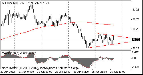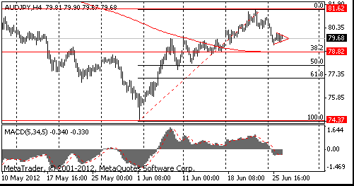 В течении сегодняшней сессии пара консолидируется в рамках треугольника. В случае преодоления нижней границы треугольника пара может продолжить снижаться, достигнув области Y78,80 (МА(200) для Н4 и 38,2% FIBO Y74,40-Y81,60).