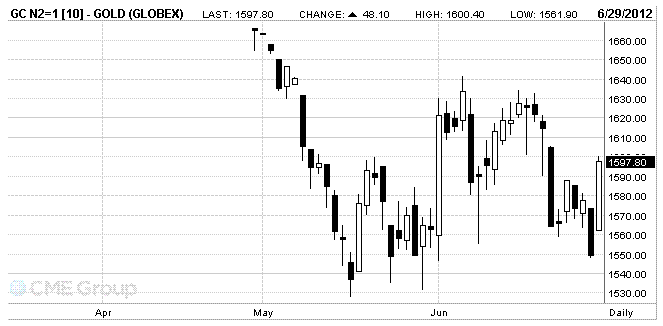 Фьючерсы на золото выросли на 3% в пятницу, показав первый ежемесячный рост за последние 5 месяцев. Лидеры еврозоны на саммите ЕС договорились принять чрезвычайные меры, чтобы снизить стоимость заимствований для Италии и Испании и создать единый наблюдательный орган для банков еврозоны к концу этого года.