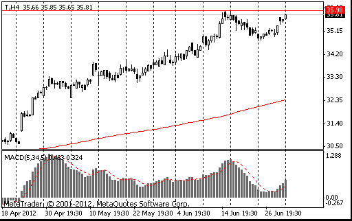 • Акции AT&T (Т) приближаются к сопротивлению $36,00 (4-х летний максимум)