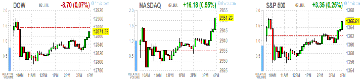 В понедельник фондовые индексы США закрылись со смешанной динамикой. S&P 500 и Nasdaq сумели закончить сессию в зеленой зоне, несмотря на неожиданные результаты отчета ISM, продемонстрировавшие сокращение активности в секторе обрабатывающей промышленности США (вероятно, ряд инвесторов расценил эти цифры как указание на то, что ФРС примется более активно стимулировать экономику).