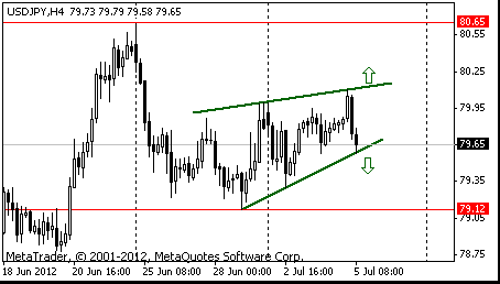 Если пара преодолеет уровень поддержки фигуры, то возможно дальнейшее снижение к уровню Y79.10 (минимум 29 июня).