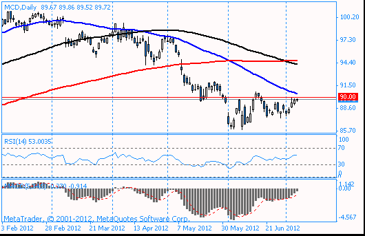 В данный момент акции котируются по  $89,77. Если акции смогут преодолеть отметку $90,00, рост может продолжиться до $90,50 (МА(50) для D1).