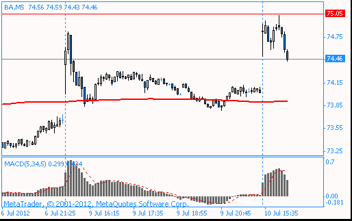 На этот раз компания получила заказ на поставку 20 единиц самолетов данной серии от кувейтской Alafco. Акции BA в данный момент котируются по $74.46 (+0.57%), отступив от сессионного минимума, который был установлен выше отметки $75.00.