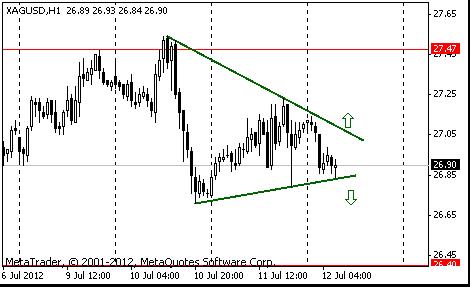 В случае пробоя линии поддержки фигуры, возможно снижение к $26.40 (138.2% FIBO $27.55-$26.70). Этот вариант наиболее вероятен, т.к. общий тренд по серебру остается нисходящим.