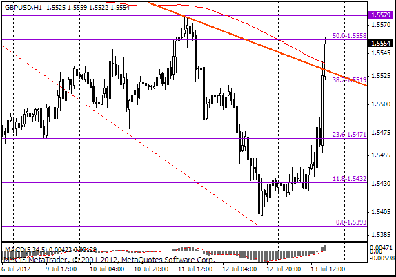 Пара GBP/USD обновила максимум предыдущего дня, пробив при этом линию сопротивления. Рост может продолжится к уровню 1,5580, который является максимумом 11 июня.