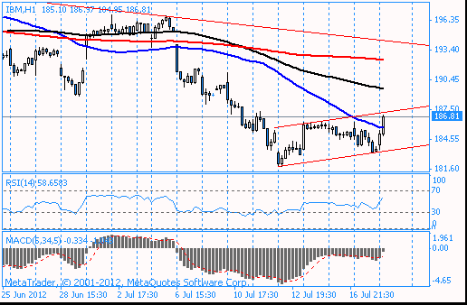 В данный момент акции IBM котируются по $186.81 (+1,63%). Сопротивление оказала верхняя граница восходящего канала от 12 июля.