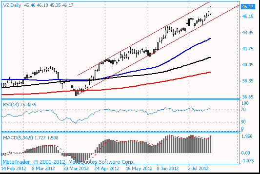 Стоит отметить, что акции VZ в данный момент торгуются в области исторического максимума, который был достигнут в октябре 2007 года на уровне $46,21.