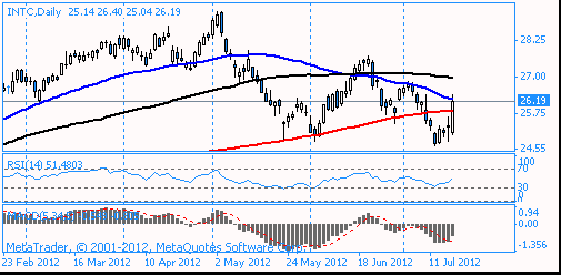 Акции крупнейшего в мире производителя полупроводников Intel (INTC) поднялись на 3,3%. Менеджмент сообщил о снижении квартальной прибыли, но результат тем не менее побил ожидания Уолл-Стрит. Прибыль на акцию составила 54 центов на акцию против прогнозов аналитиков на уровне 52 центов.