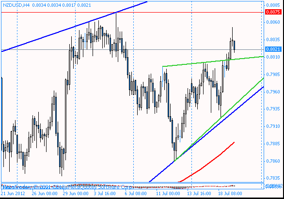При анализе валютной пары на графике Н4 можно заметить, что в течении сегодняшней сессии произошло пробитие фигуры “треугольник”. После существенного роста курс начинает постепенно снижаться. Ожидается, что курс может устремится к линии поддержке, которая раньше выступала верхней границей треугольника, после чего пара продолжит свой рост. Иными словами данную ситуацию можно описать как пробитие-откат-продолжение движения. Если оценить величину треугольника, можно определить цели для роста пары, которые как раз находятся у линии сопротивления от 21.06 и 05.07. Но для такого роста, сперва, придется преодолеть сильный уровень сопротивления со значением $0.8075, который может заставить пару немного снизится.