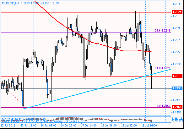 Пара EUR/USD пробила линию поддержки от 13 и 16 июля, которая сдерживала пару в течении недели. Курс три раза тестировал эту линию, но на четвертый раз пара смогла преодолеть данный уровень, и продолжила снижение, обновив при этом минимум 18 июля. Ожидается, что теперь пара будет стремится к минимальному значению 13 июля, которое находится на уровне 1,2160.