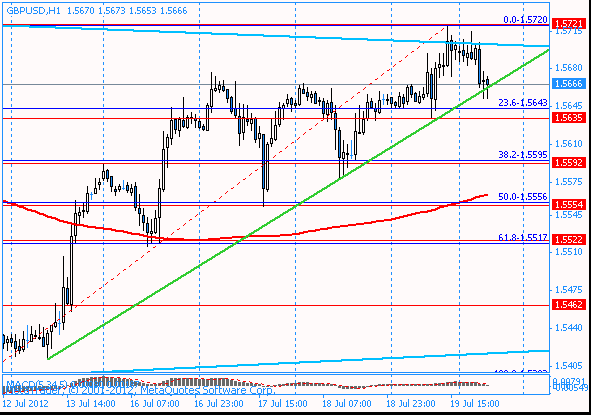 Пара GBP/USD находится сейчас на границе линии поддержки, которая построена по минимальным значениям 13 и 18 июля. Как видно из графика, цена уже тестирует данную линию в четвертый раз, что может указывать на вероятное пробитие. Если это произойдет цена может упасть до уровня $1,5595 или даже вплоть к $1,5555/60, где сейчас находится уровень 50% по Фибо ($1.5395-$1.5722) и проходит линия MA(200) для Н1.