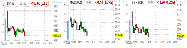 Давление на индексы оказало повышение опасений относительно усугубления долгового кризиса в Европе на фоне очередного роста доходности 10-летних испанских облигаций выше психологической отметки 7%.