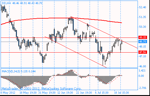 Ситуация на графике: акции отступили от верхней границы нисходящего канала, который берет свое начало в средине июня. Смешанные квартальные данные, а также ожидания дальнейшего замедления экономической активности указывают на высокую вероятность снижения акций DD в ближайшие месяцы в область $44-$43, где расположена нижняя граница канала и минимумы декабря 2011 года.
