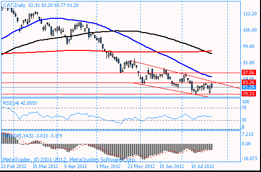 График: акции CAT находятся в рамках нисходящего канала, который берет свое начало в конце мая. Сильные квартальные данные могут позволить акциям компании преодолеть верхнюю границу сформировавшегося канала и укрепится для начала в область июльских максимумов $87,50.