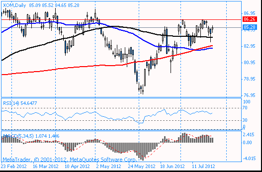 График: акции XOM в течении последнего месяца консолидировались в рамках $82,80-$86,30. Ближайшим сопротивлением является область июльских максимумов ($86,30). Ближайшая поддержки - $84,00 (МА(100) для D1), ниже потери могут увеличится до $82,80 (область июльского минимума, МА(200) и МА(50) для D1).