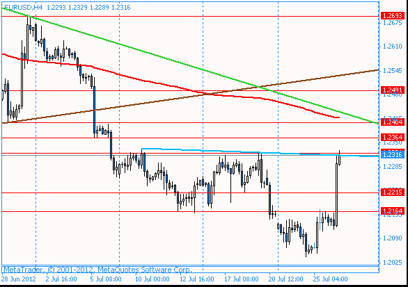 На графике Н1 видно, что пара пробила уровень сопротивления $1,2320, который являлся максимумом 19 июля, и сейчас приближается к следующему уровню - $1,2335 (максимум 10 июля). Если рост продолжится, то курс может устремится к линии сопротивления, построенной от 01.05 и 29.06.