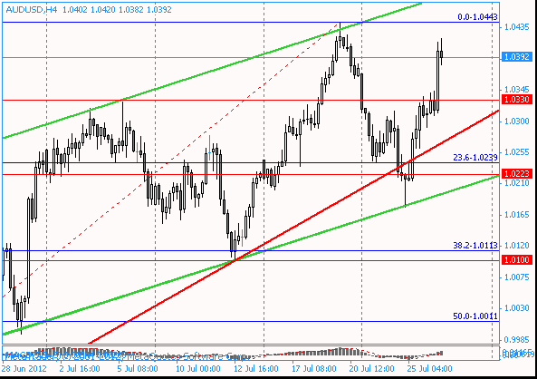 На графике Н4 пары AUD/USD видно, что после касания нижней границы канала курс устремился вверх. Ближайшей целью для роста пары выступает сейчас уровень $1,0445, который является максимумом 19 июля. Преодоление этого значения может направить пару до следующего и более значимого уровня сопротивления $1,0475 (максимум 27 апреля). Также на этом значении сейчас находится верхняя граница восходящего канала.