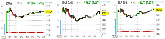 Индексы выросли сегодня на фоне снижения опасения относительно долгового кризиса в Европе, что стало результатом комментариев президента ЕЦБ Марио Драги. В своем выступлении глава ЕЦБ отметил, что "еврозона гораздо сильнее, чем многие полагают". Также было сказано, что европейский центробанк готов сделать все необходимое для сохранения евро.