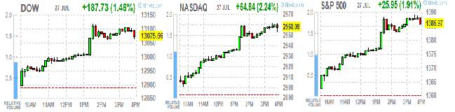 Индексы сегодня продолжили вчерашнее ралли, при этом индекс Dow вырос более чем на 100 пунктов, обновив при этом июльский максимум и показав максимум выше отметки 13 000.