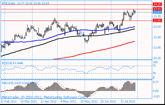 График: акции PFE с начала года подорожали почти на 12%. На премаркете акции компании обновили июльский максимум, поднявшись выше отметки $24, Выше сопротивление расположено в области $24,25 (максимум 2008 года.