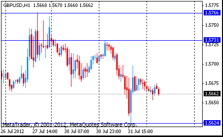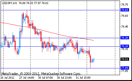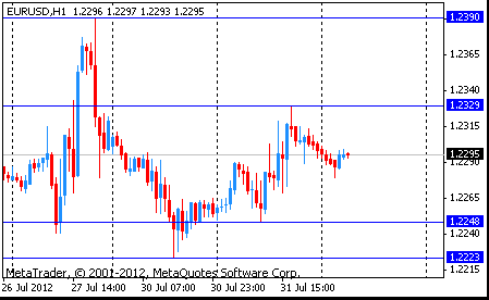 Евро нивелировал прежнее падение несмотря на падение на фондовых площадках Азии. Рынок находится в ожидании решений со стороны центральных банков для поддержания экономического роста в мире. Инвесторы обеспокоены ослаблением производства по всему миру. На рынке ходят разговоры о том, что ФРС может принять новые меры стимулирования экономического роста, такие как покупка ипотеки или государственных ценных бумаг с целью снижения долгосрочных процентных ставок. Говорят и о таком варианте, при котором ФРС просто пообещает принять дальнейшие меры в случае необходимости. Власти могут решить подождать до сентября, когда они представят новые официальные экономические прогнозы, прежде чем предпринимать что-то значимое. Что касается, решений со стороны ЕЦБ, то ожидания того, что ЦБ обнародует масштабные меры, направленные на сдерживание долгового кризиса в еврозоне, выглядят также чрезмерными.