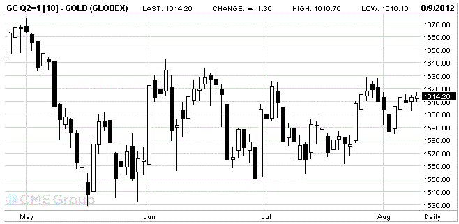 Стоимость августовского фьючерса на золото на COMEX сегодня выросла до уровня 1616.7 доллара за унцию, и сейчас торгуется на отметке 1614.2 доллара за унцию.