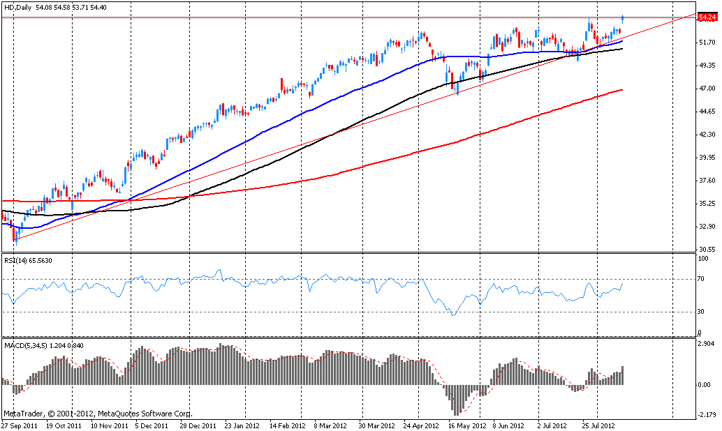 В данный момент акции HD торгуются по $54.44 (+3.07%). Поддержку акциям компании оказывает опубликованный ранее квартальный отчет.