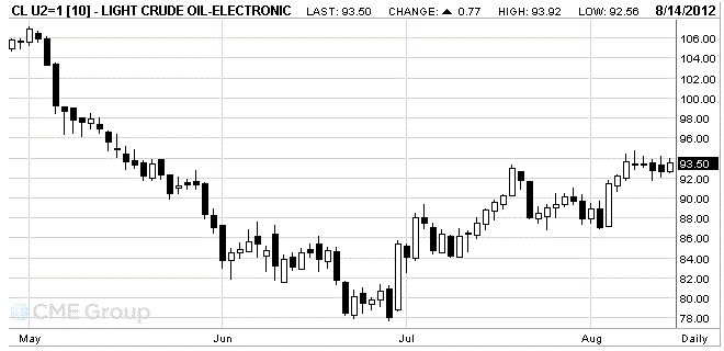 Стоимость сентябрьских фьючерсов на американскую легкую нефть марки WTI (Light Sweet Crude Oil) на NYMEX сейчас составляет $93,50 за баррель.