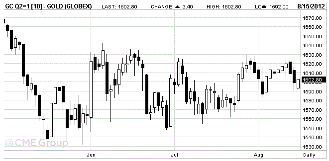 Стоимость августовского фьючерса на золото на COMEX сегодня достигла минимума на уровне 1592.0 доллара за унцию, после установила максимум сессии и сейчас торгуется на отметке 1602.8 доллара за унцию.