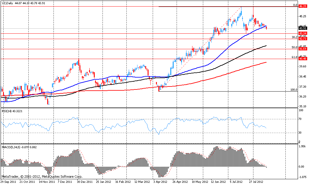 Акции VZ обновили августовский минимум, достигнув отметки $43,78. При этом был акции упали ниже МА(50) для D1. В данный момент акции VZ торгуются по $43,91 (-0.57%).