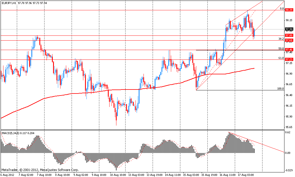 Вслед за евродолларом пара упала, показав сессионный минимум на уровне Y97,71. Однако, пока пара не сумела закрепится ниже области поддержки Y97,80.