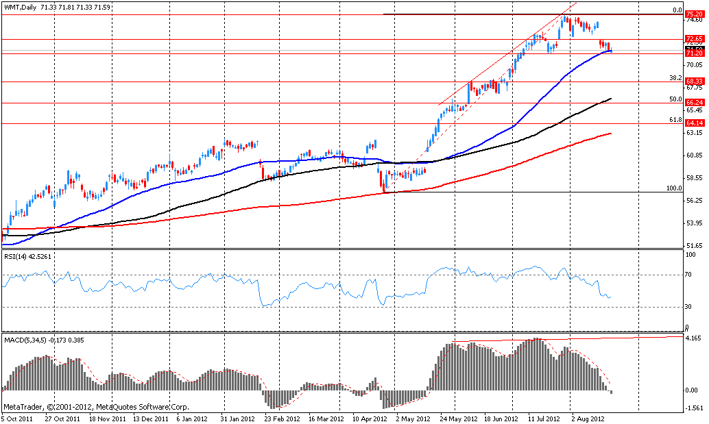 В данный момент акции WMT торгуются по $71,50 (+0.30%). Поддержку акциям оказала область $71,50/20 (МА(50) для D1 и минимум 23 июля). Ниже поддержка расположена в области $68,30 (38,2% FIBO $57,00-$75,20).