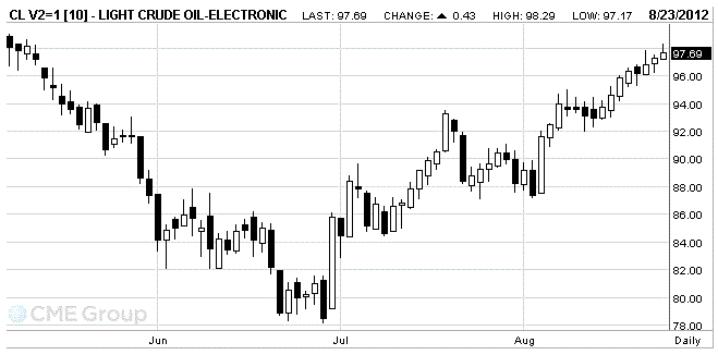 Стоимость октябрьских фьючерсов на американскую легкую нефть марки WTI (Light Sweet Crude Oil) на NYMEX сейчас составляет $97,69 за баррель.