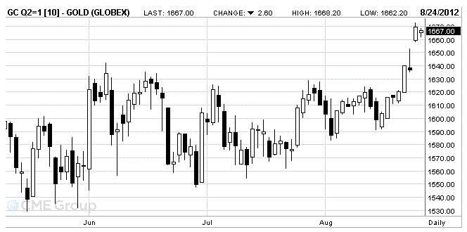 Стоимость августовского фьючерса на золото на COMEX сейчас составляет 1667 доллара за унцию.