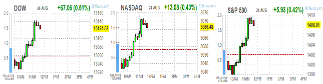 Однако, после более пристального рассмотрения статистика по заказам на товары длительного пользования оказала поддержку рынкам. Так, общий показатель вырос на 4,2% в июле против прогноза +2,8% и значения за июнь +1,6%. При этом, столь значительный рост показателя в июле был по большей части результатов существенного увеличения заказов на самолеты у Boeing. Без учета заказов на транспорт показатель в июле упал на 0,4% при ожиданиях роста на 0,5%. На этом фоне выросли надежды участников рынка на новые вливания ликвидности со стороны ФРС. На следующей неделе состоится выступление председателя ФРС Бена Бернанке в Джексон Хоуле. Инвестора надеются, что по итогам ожидаемой встречи будут получены дополнительные сигналы относительно дальнейших мер количественного смягчения.