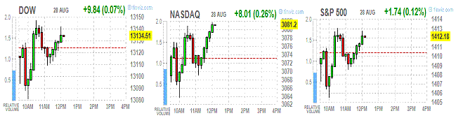 Индексы находятся в небольшом плюсе. В фокусе участников рынка находится экономический симпозиум в Джексон Хоуле, который начнется позже на текущей неделе. Особенно участники рынка ожидают выступления на данном ежегодном мероприятии Бена Бернанке, главы ФРС, которую он произнесет в пятницу, 31 августа.