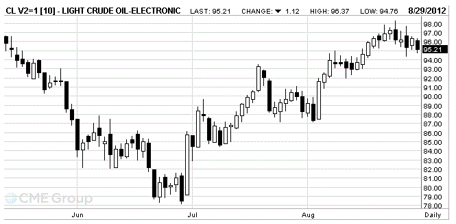 Стоимость октябрьских фьючерсов на американскую легкую нефть марки WTI (Light Sweet Crude Oil) на NYMEX сейчас составляет $95,20 за баррель.