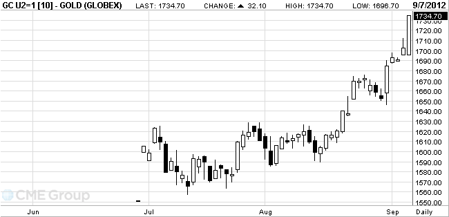 Стоимость сентябрьского фьючерса на золото на COMEX выросла до 1736.2 доллара за унцию.