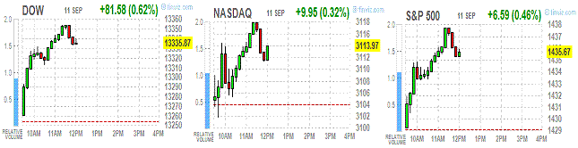 Поддержку рынкам также оказывают сообщения из Европы. Сегодня Конституционный суд Германии заявил, что не будет откладывать решение о Европейском механизме стабильности, назначенное на среду, опровергнув появившиеся на рынке слухи. Напомним, что завтра станет известно решение Конституционного суда Германии об участии страны в Европейском стабилизационном механизме (ESM).В составе индекса DOW почти все компоненты выросли в цене. В минусе находятся только акции Kraft Foods (KFT, -0.80%), American Express (AXP, -0.63%) и Home Depot (HD, -0.56%). Больше остальных выросли в цене акции Alcoa (AA, +2.98%).