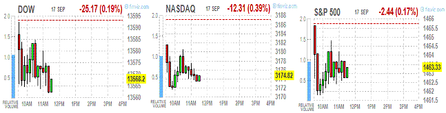 Давление на индексы оказал вышедший индекс активности в производственном секторе от ФРБ Нью-Йорка, который в сентябре неожиданно упал до уровня -10.4 против -5.85 в августе и прогноза -1.9. Однако, отрицательная динамика больше связана не с слабыми данными, а с снижением эйфории по поводу запуска нового раунда количественного смягчения. Фондовые индексы находятся на многолетних максимумах - уровнях, которые не сильно привлекательны для покупок. Более того, недавний рост индексов был вызван не фундаментальными факторами, а действиями центробанков США и Европы. В ближайшее время фокус участников рынка сместится в сторону грядущего сезона доходов, который, учитывая дальнейшее ухудшение ситуации в мировой экономики, может оказаться слабым. На этом фоне рынки могут существенно скорректироваться от достигнутых уровней.В составе индекса DOW большинство компонентов упали в цене. В плюсе находятся только 9 компонентов, среди которых больше остальных выросли акции Chevron Corporation (CVX, +0.78%). Больше остальных упали в цене акции Bank of America (BAC, -1.99%).