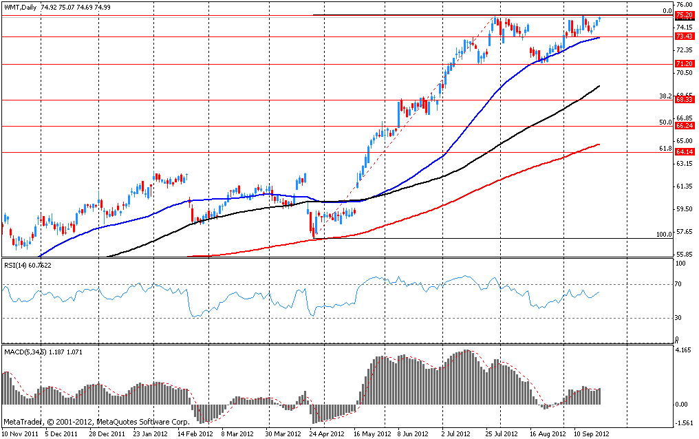 • Акции Wal-Mart Stores Inc (WMT) выросли выше отметки $75.00