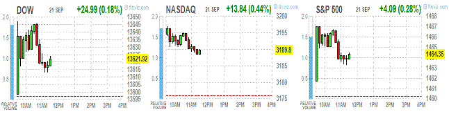 Ожидается, что план будет объявлен 27 сентября и будет сосредоточен на структурных реформах в экономике Испании по просьбе ЕС, а не на новых налогах и сокращение расходов.Среди индексов максимальный рост демонстрирует Nasdaq, поддержку которому показывают акции Apple Inc (AAPL, +0.86%). В свою очередь поддержку акциям AAPL оказывает начало продаж iPhone 5.В составе индекса DOW большинство компонентов находятся в плюсе. Лидерами являются акции AT&T (T, +1.48%). Максимальные потери несут акции Hewlett-Packard (HPQ, -0.99%).