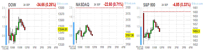 Основные фондовые индексы США находятся в минусе на фоне опасений относительно усугубления долгового кризиса в Европе на фоне разногласий лидеров ЕС относительно текущих проблем.