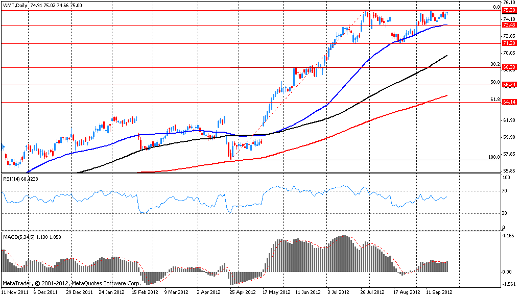 • Акции Wal-Mart (WMT) поднялись выше уровня $75,00
