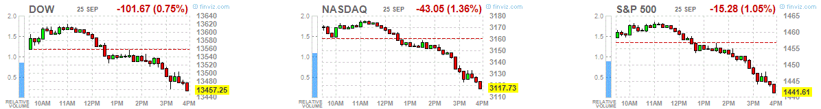 Американские акции резко снизились, стирая ранее достигнутые позиции после того, как Президент ФРС-Филадельфия Плоссер сказал, что новая программа по покупке облигаций центральным банком, вероятно, не будет стимулировать экономический рост. Плоссер заявил, что экономические исследования показывают, что дополнительные покупки активов вряд ли снизят долгосрочные процентные ставки на значительную сумму, и что снижение ставок еще на несколько базисных пунктов не будет стимулировать рост и найм. Также он отметил, что американская экономика растет "умеренными темпами" и, вероятно, будет расширяться примерно на 3% в 2013 и 2014 годах, сказал он.