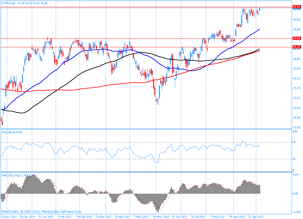 В данный момент акции XOM котируются по $92.46 (+0.83%). Выше расположено сильное сопротивление в виде 4-х летнего максимума, который был достигнут в августе (область $92,50/60).
