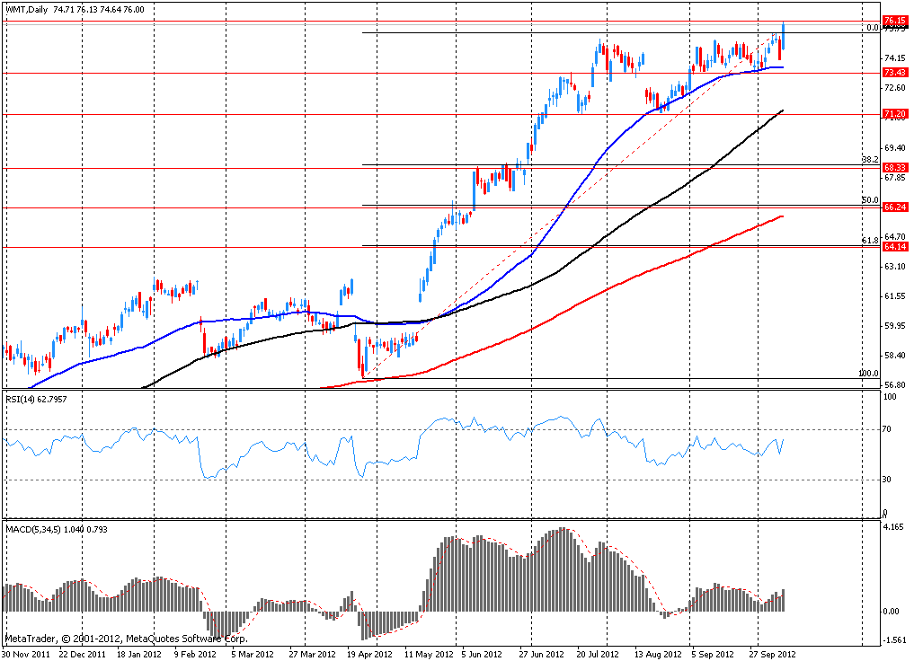 В данный момент акции WMT компании котируются по $76.01 (+2.52%). Максимум был установлен на уровне $76.15.