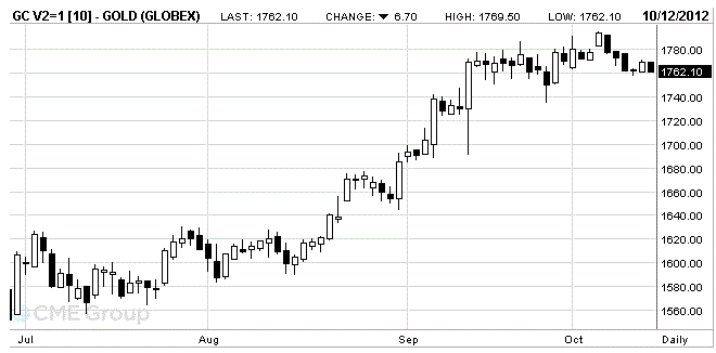 Стоимость октябрьского фьючерса на золото на COMEX упала сегодня на 6.7$ и сейчас составляет 1762.1 доллара за унцию.
