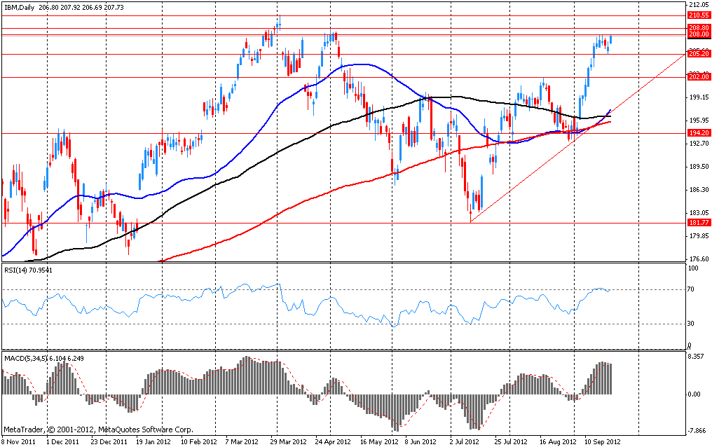 Акции IBM в данный момент торгуются по $210.40 (+0.70%).15 октября акции аналитики Stifel Nicolaus подтвердили рейтинг акций IMB на уровне “покупать”, целевая стоимость повышена с $221 до $243.
