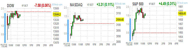 Большинство компонентов индекса DOW демонстрируют рост. Больше остальных снизились новостные International Business Machines (IBM, -4.78%) и Intel (INTC, -2.75%). Лидируют акции Alcoa (AA, +1.79%).